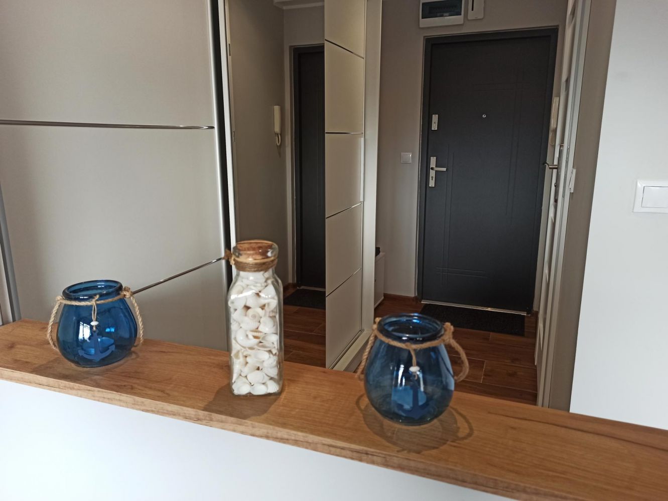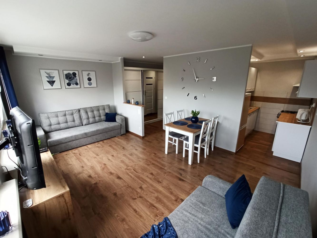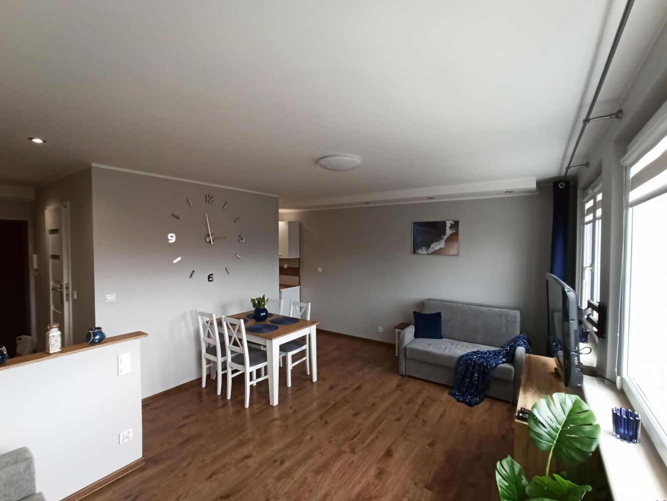 Sam apartament jest bardzo przestronny i nowocześnie urządzony. Jest idealny zarówno dla pary, jak i rodzin z dziećmi, gdyż składa się z dużego pokoju z aneksem kuchennym oraz łazienki i korytarza o łącznej powierzchni 34m2. Zastosowane w nim dodatki w kolorze szafiru jeszcze bardziej podkreślą nadmorski klimat i z pewnością umilą Wam ten pobyt!