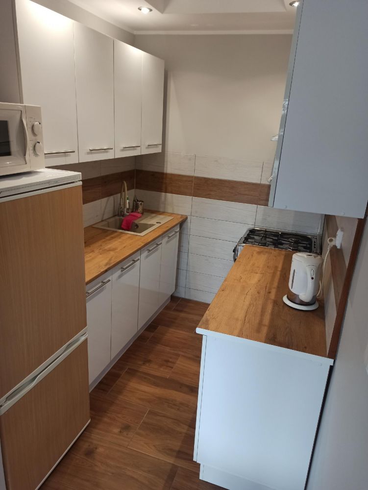 Apartament składa się z dużego pokoju (2 x rozkładana sofa) z aneksem kuchennym (pełne wyposażenie) oraz łazienki z kabiną prysznicową. Widok z okna na plac zabaw dla dzieci.